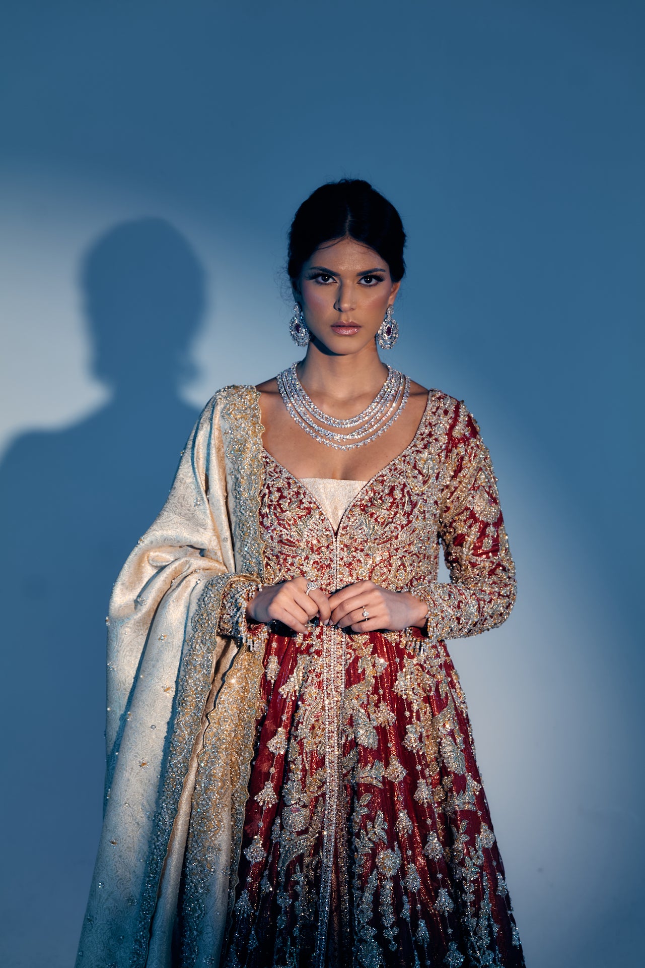 'Aliyah' - a stunning red bridal gown encrusted with rich gold work, crystals and diamanté, encapsulating an infinite, brilliant shine. This bridal gives a breathtaking finish and is a class apart. A mesmerising Bridal