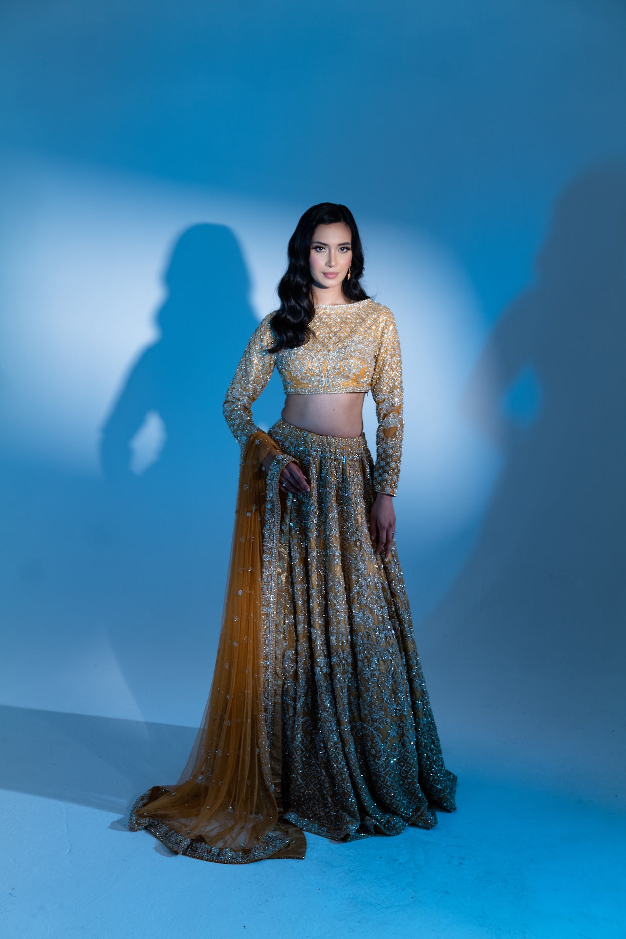 'Jasmine' - a rich gold lengha choli encrusted with hand worked crystals, diamanté and brilliant shine, silver work.