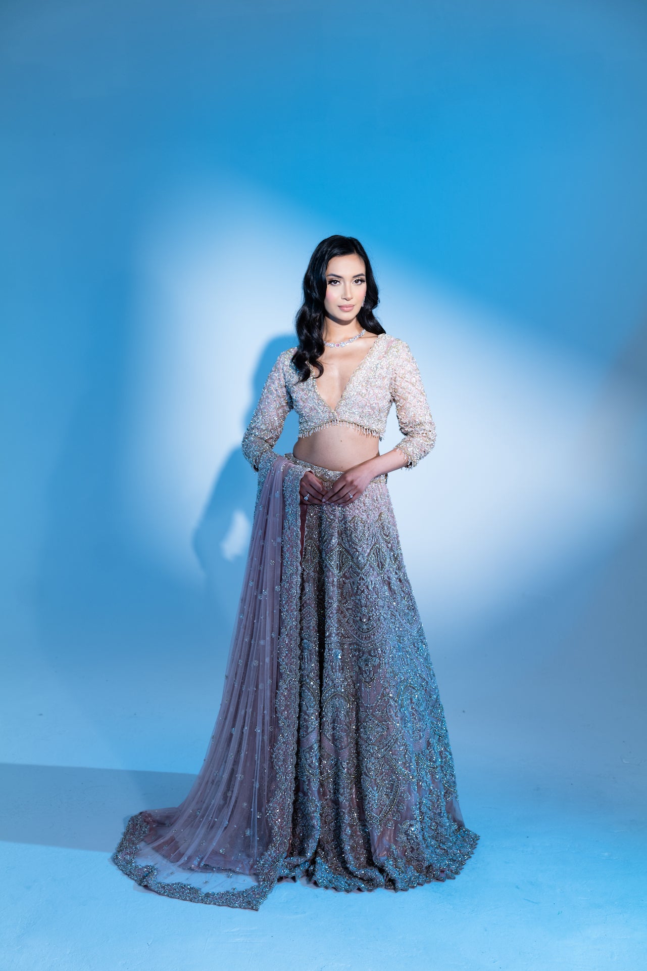 'Katrina' - a sumptuous, blush-pink bridal lengha choli encrusted with hand worked silver work, crystals and diamanté, encapsulating an infinite, brilliant shine. This stunning bridal creates a moment of pause for its feminine yet elegant impact. A bridal to remember