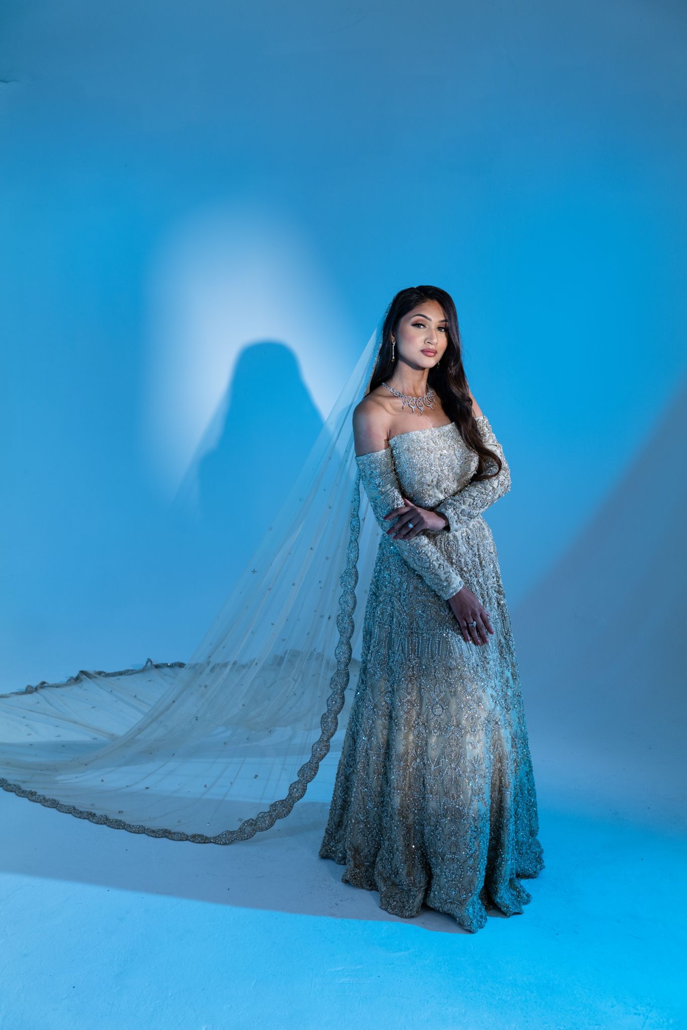 'Yasmin' - an avant-garde champagne gold princess bridal encrusted with a mix of handcrafted champagne, silver and gold stones and work, delicately draped with a dramatic champagne veil, this bridal is bold as it is beautiful